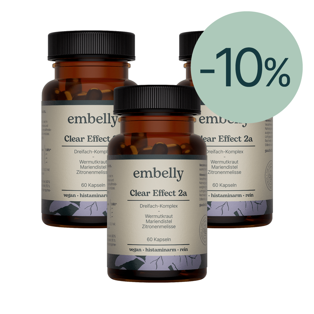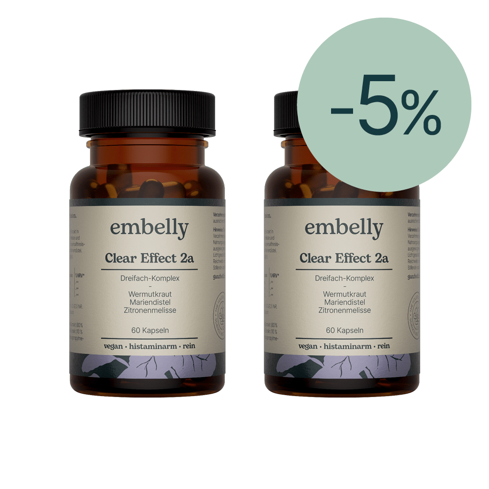 Clear Effect 2a ist ein Dreifach-Komplex aus hochdosiertem, naturreinen Wermutkraut-Extrakt in einer bioaktiven Matrix aus Mariendistel und Zitronenmelisse. Die magensaftresistenten Kapseln sorgen für eine verzögerte Freisetzung der Inhaltsstoffe und eine gute Verträglichkeit. Mindestens 80 % des Mariendistel-Extrakts sind wertvolles Silymarin. Von Ärzten entwickelt und empfohlen.