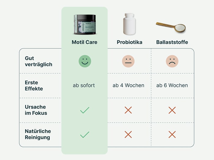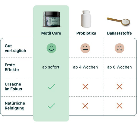 Die natürlichen Inhaltsstoffe von Motil Care sind nicht nur besonders gut verträglich, sondern entfalten Ihre Kräfte ab der ersten Einnahme. Scharf- und Bitterstoffe können sofort den Darm aktivieren und somit die ganz natürliche Reinigung unterstützen. Im Gegensatz dazu werden Probiotika und Ballaststoffe häufig nicht gut vertragen und helfen - wenn überhaupt - meist viel später, da das Wirkprinzip ist: mehr Bakterien bzw. mehr Bakterienfutter. Ist der eigene Darm aber träge, mag das gar nicht helfen.